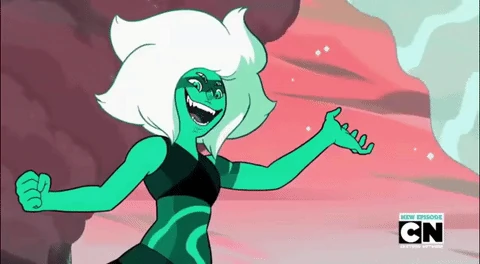 Malaquita é a fusão da Jasper com a Lápis Lazúli. Como eu não falei no outro post sobre Steven, vou definir rapidinho o que é a fusão para as gems. Fusão é a união física, emocional e mental de duas ou mais gems, podendo ser ou não do mesmo tipo. Quando são de diferentes tipos, essa fusão será a soma das personalidades, e quando do mesmo tipo, será uma réplica ainda maior.
